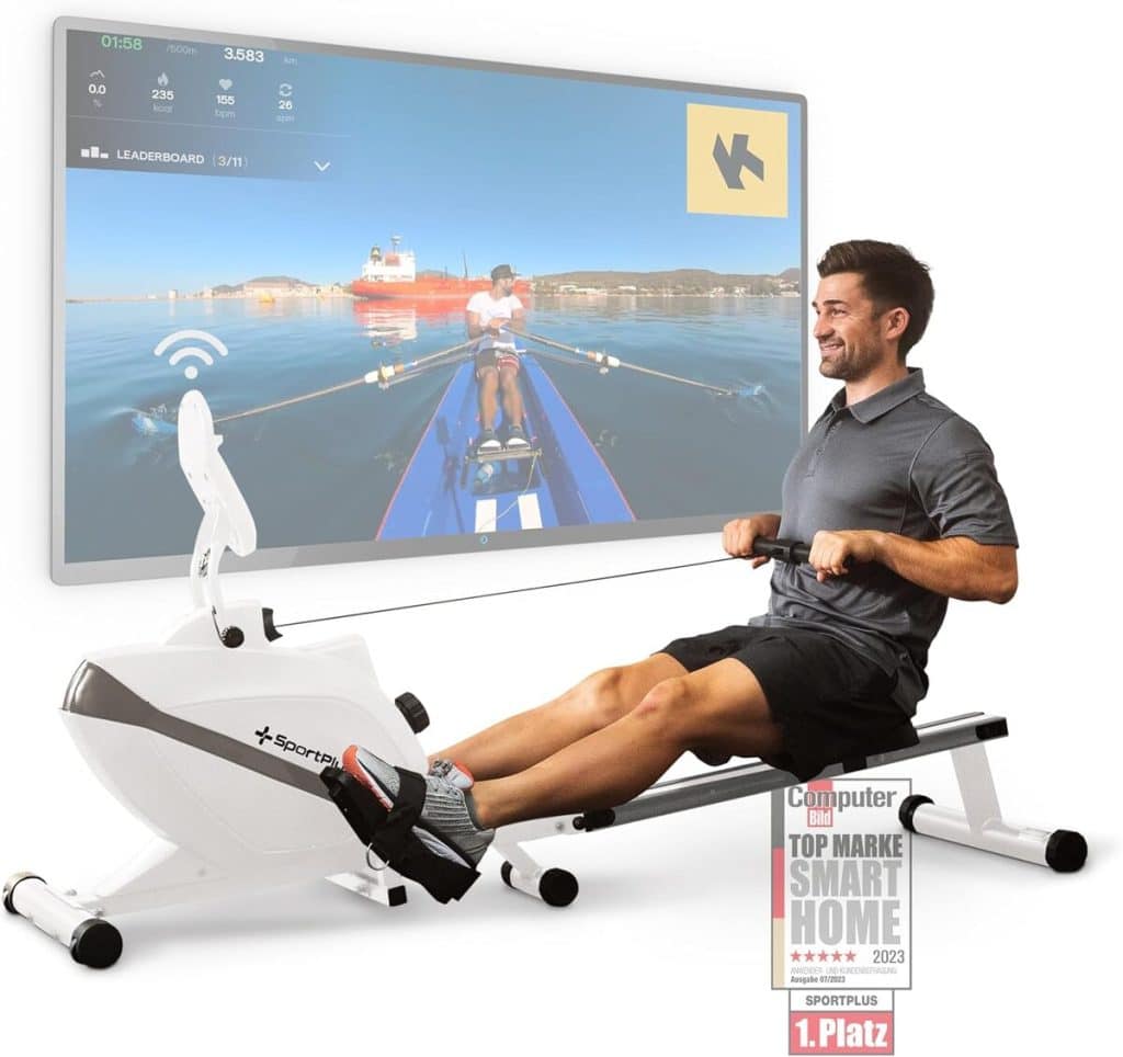 SportPlus Rameur pour la Maison Pliable - Conçu en Allemagne - Système de freinage magnétique Silencieux - Compatible avec l'application - Masse d'inertie de 8 kg - Capacité Maximale 150KG